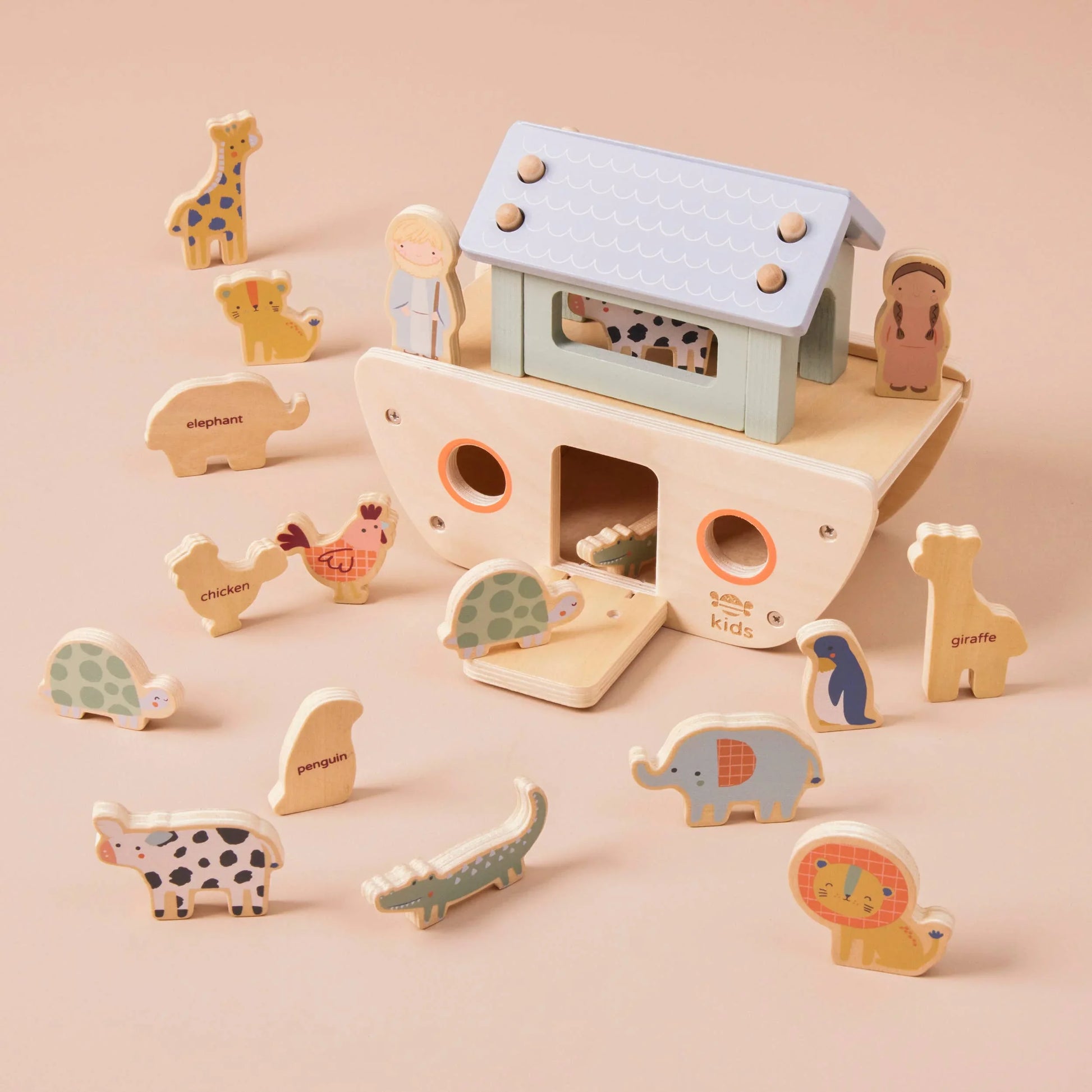 The animals went in two by two Hoorah! Hoorah! This adorable wooden playset lets little learners recreate one of their favourite stories — the tale of Noah’s Ark! Featuring a classic wooden ark, this set helps little learners develop their sensory, motor and hand-eye coordination skills through make-believe play. Curious minds will love the chunky and tactile animal pieces, including crocodiles, cows and roarsome lions, improving recognition of all their favourite animals. Enter the animal kingdom with this educational and fun play set!